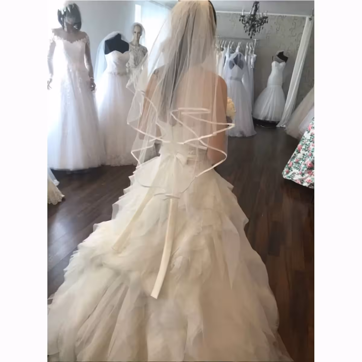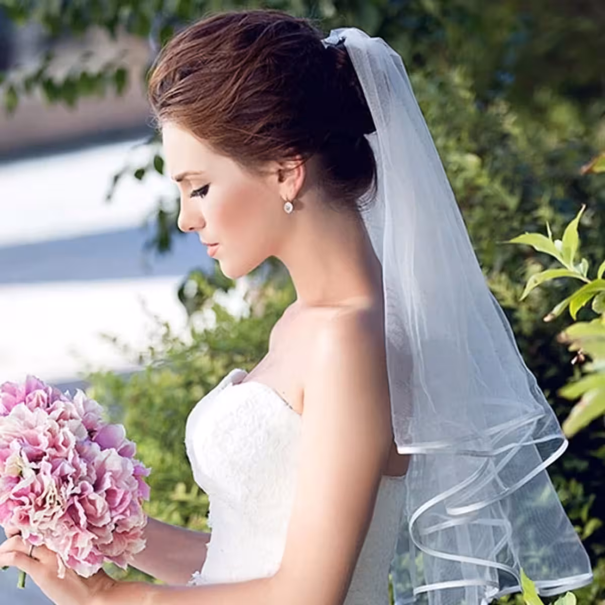 Pasirinkite šį trumpą ar vidutinio ilgio baltą tiulio šydą klasikiniam, bet moderniam įvaizdžiui, kuris pritrauks visas žvilgsnius per didžiąją dieną.