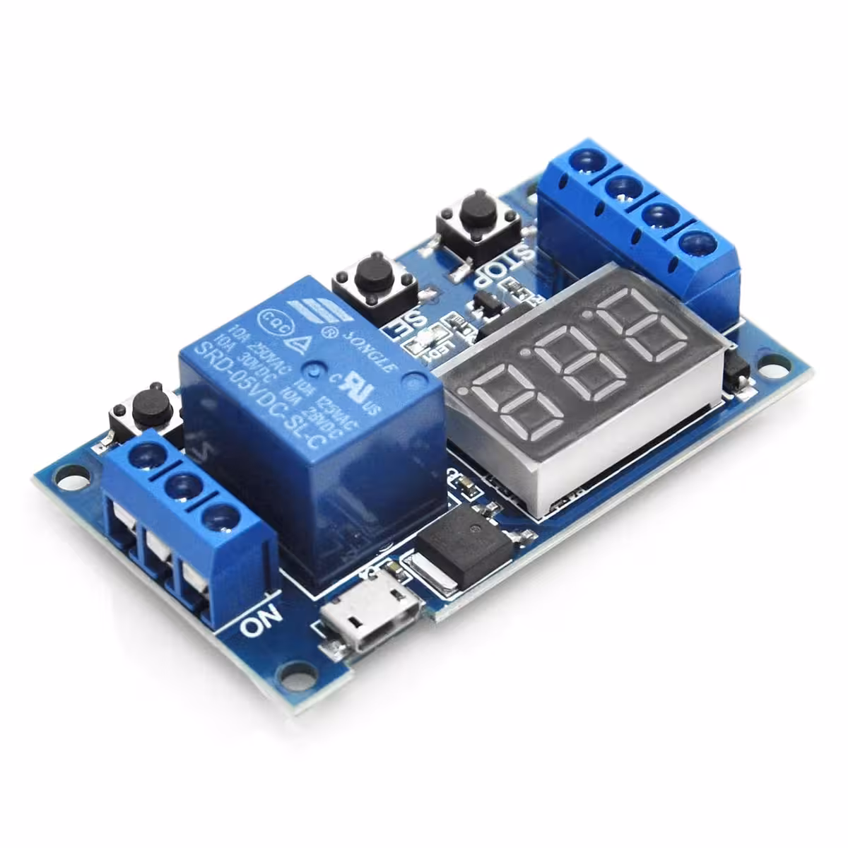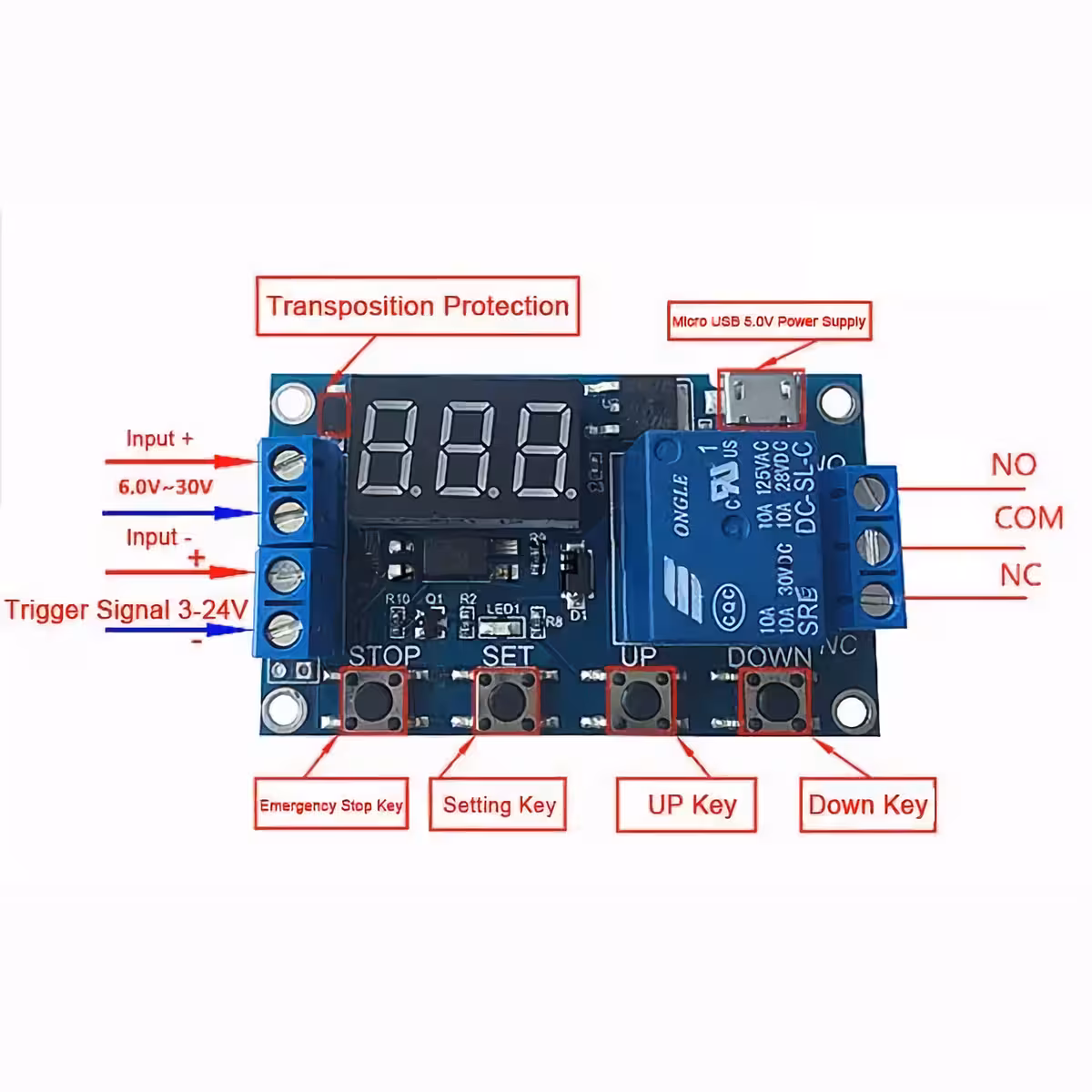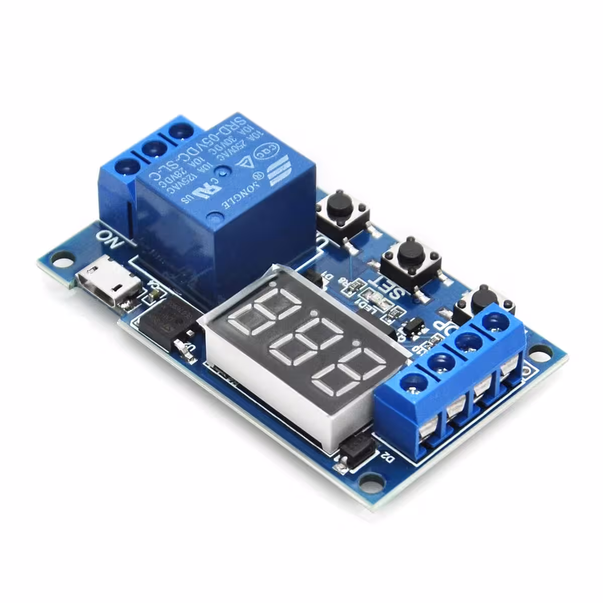 Laikmačio relės modulis su reguliuojamu vėlavimu ir laiku, suderinamas 6–30V (galimas maitinimas per MicroUSB 5V). Idealus pramoniniams ir DIY projektams, kuriems reikalingas relės modulis su vėlavimu, valdymu ir reguliuojamu laiku, su skaitmeniniu ekranu bei apsauga nuo trukdžių.