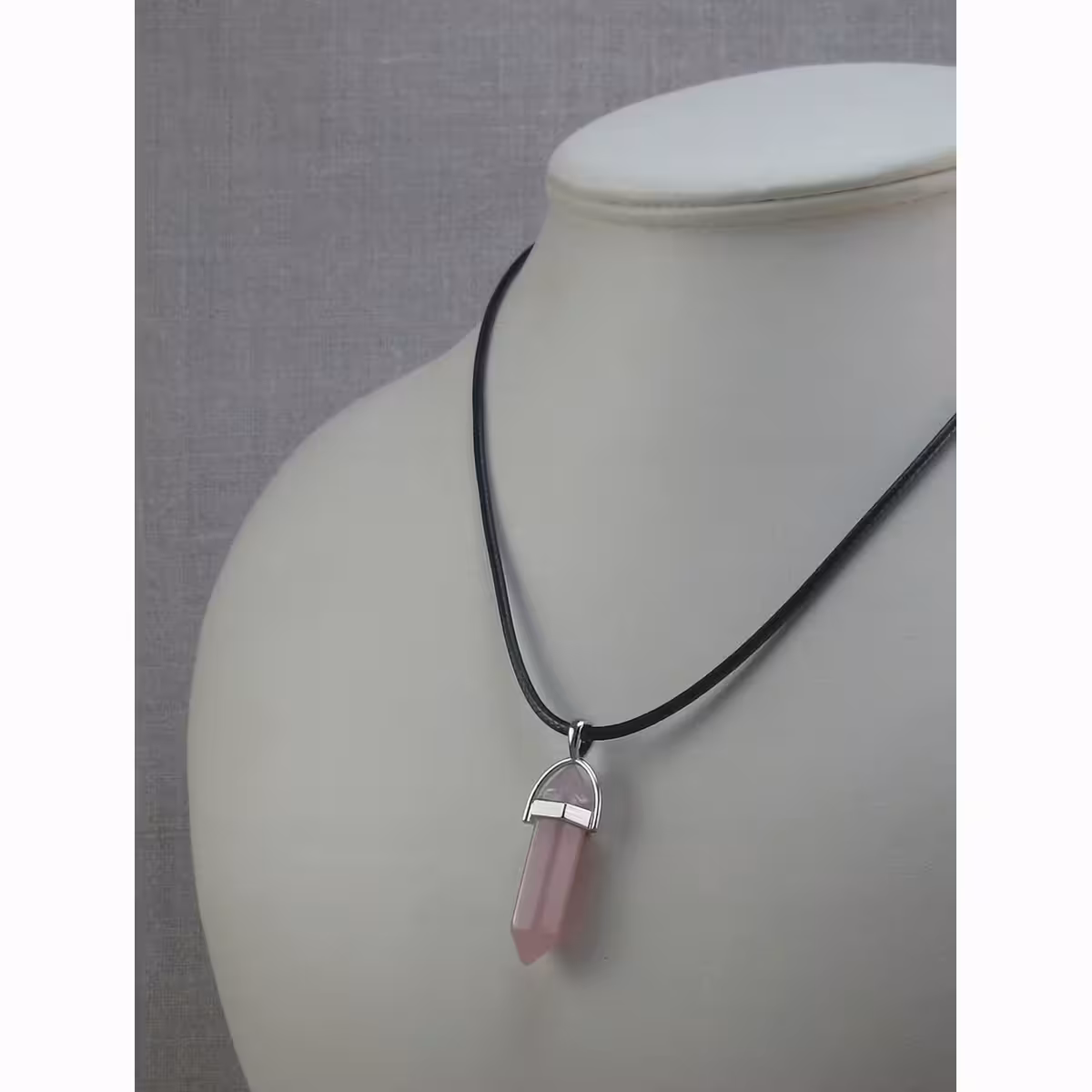 Komplekte: rožinio kvarco pakabukas ir odinė grandinėlė, elegantiška ir patvari, su karabino tipo užsegimu.