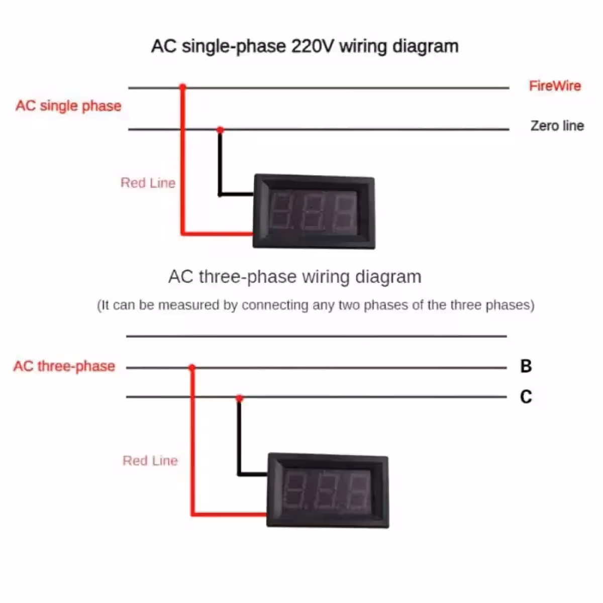 Šis skaitmeninis voltmetras yra specialiai sukurtas kintamosios srovės (AC) įtampai matuoti. Veikia efektyviai vienfazėse sistemose, matuodamas įtampą tarp fazės ir nulio, taip pat trifazėse sistemose, matuodamas įtampą tarp bet kurių dviejų fazių. Maitinimas gaunamas tiesiogiai iš matuojamos įtampos, nereikalaujant išorinės maitinimo šaltinio.